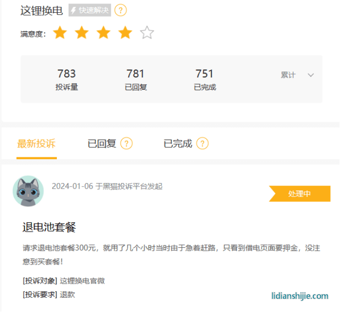 《港湾商业观察》查询黑猫投诉平台发现,截至1月6日,这锂换电投诉量有783条,已完成751条,近30天投诉量29条,已完成2条,投诉完成率偏低。