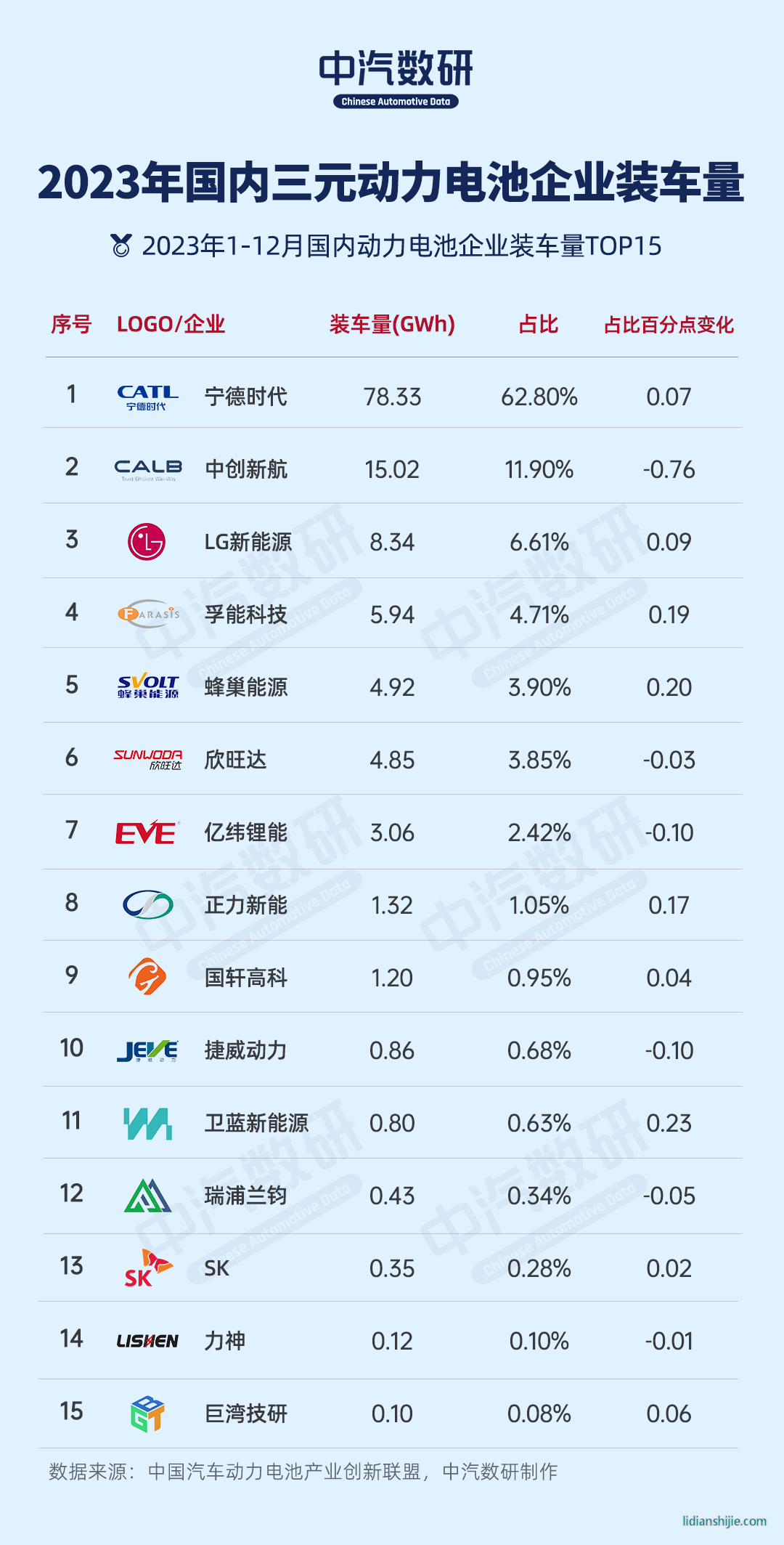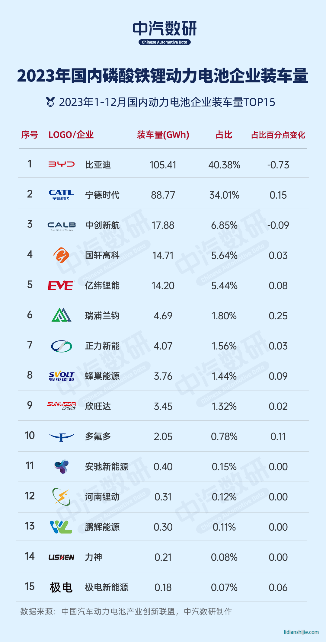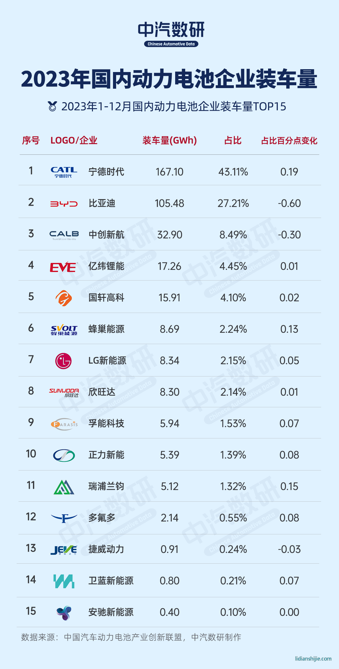 2023年1-12月,中国动力电池企业装车量TOP15分别是宁德时代、比亚迪、中创新航、亿纬锂能、国轩高科、蜂巢能源、LG新能源、欣旺达、孚能科技、正力新能、瑞浦兰钧、多氟多、捷威动力、卫蓝新能源、安驰新能源。
