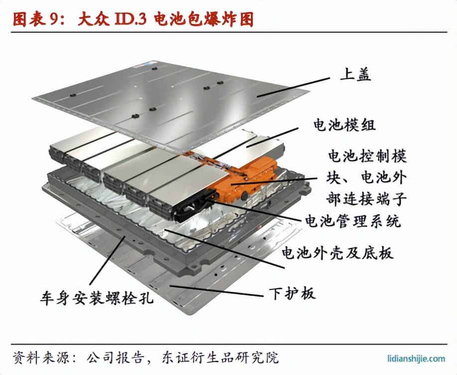 在结构上,动力电池经过了多轮“进化”。行业最早的结构是MTP(Module to Pack),这种结构奠定了动力电池的结构雏形,包括电芯、模组和电池包三部分。一个模组由多个电芯组成,多个模组加上BMS、配重模块等零部件组成一个电池包,然后装在车内。大众 ID.3 使用的就是MTP结构电池,其电池包由壳体、电池模组、电池控制模块和电池管理系统等组成。