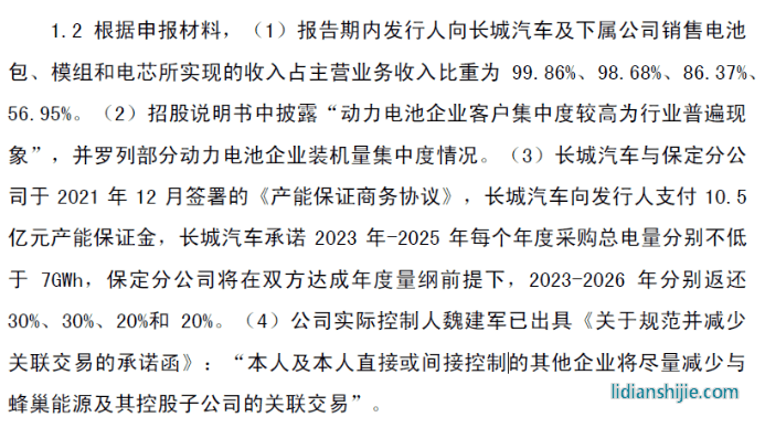 2019年至2021年及2022年6月30日(报告期内),蜂巢能源向长城汽车及下属公司销售电池包、模组和电芯,实现收入分别为8.12亿、16.49亿、36.61亿、19.83亿,占主营业务收入比重为99.86%、98.68%、86.37%、56.95%。其中,蜂巢能源主要为向长城汽车销售动力电池相关产品。