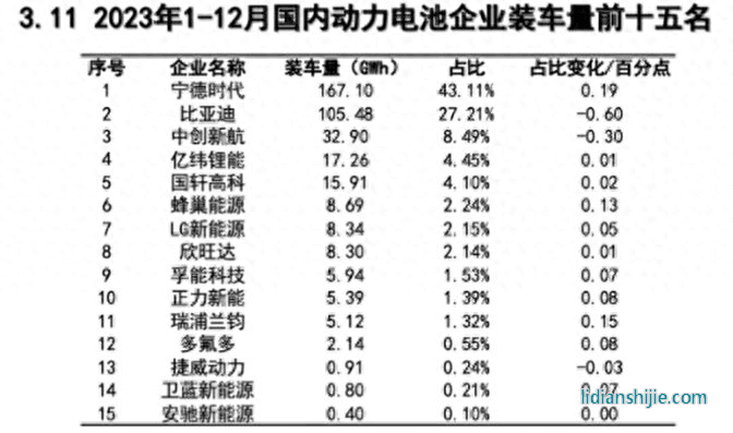 根据中国动力电池产业创新联盟最新数据,2023年全年,中国动力电池累计装车量 387.7GWh,同比增长32.6%。宁德时代以167.1GWh的装车量第一,市占率为43.1%;而比亚迪则以105.48GWh的装车量名列第二,市占率为27.2%。这意味着,占据70%市场份额的两大动力电池企业,将在今年大幅降价,动力电池有望全面进入 0.3 元 / Wh 时代。