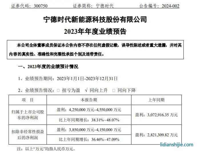 2024年1月30日晚间,宁德时代披露业绩预告显示,该公司预计2023年度归属于上市公司股东的净利润为425亿元-455亿元,同比增长38.31%-48.07%;扣除非经常性损益后的净利润为385亿元-415亿元,同比增长36.46%-47.09%。