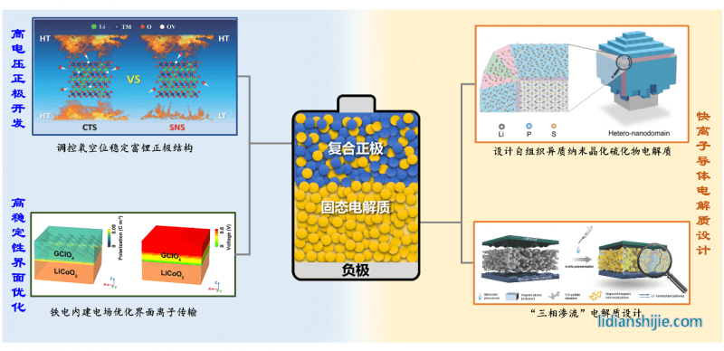 采用高电压氧化物正极材料和硫化物固态电解质的全固态锂电池具有高能量密度和高安全性的优势,可显著提升电池续航能力,是新型储能技术领域的重要研究方向,对于发展新能源汽车、智能电网、深海电源等具有重要意义。然而,氧化物正极材料在高工作电压时存在反应动力学较差的O2-氧化还原反应,产生非稳态O2p空穴和O2并引发结构相变,导致电池在大电流时容量低且衰减迅速,倍率性能和循环寿命难以满足实际应用需求。而且,硫化物固态电解质的室温锂离子电导率还有待继续提高,以加速高负载、高倍率型高电压固态锂电池的发展。