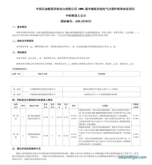 北极星储能网获悉,5月29日,中国石油济柴动力5MWh液冷储能系统部件框采中标候选人公示,据悉,海辰储能、楚能新能源、鹏辉能源、瑞浦兰钧、天合储能、中创新航和赣锋锂电共7家企业参与投标。其中中创新航和赣锋锂电被否决,最终海辰储能、楚能新能源分别为第一、第二中标候选人。