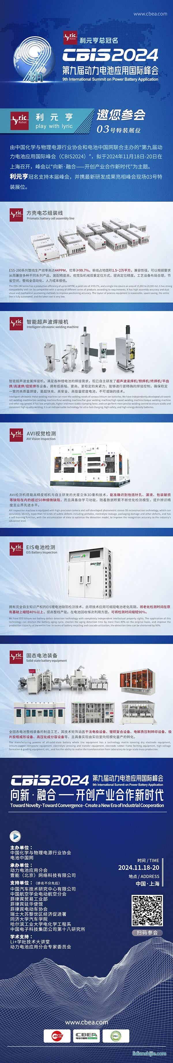 利元亨邀您参加第九届动力电池应用国际峰会(CBIS2024) 2024-09-10 电池中国网9060 核心提示:利元亨邀您参加第九届动力电池应用国际峰会(CBIS2024) 利元亨邀您参加第九届动力电池应用国际峰会(CBIS2024) 点赞 0举报收藏 0打赏 0评论 0分享 77 更多>同类锂电资讯 • 荣膺全球人材双料大奖 共话人才出海战略丨先导 • 实力领航丨先导智能光储全栈解决方案闪耀CIPESI • 先导集团王燕清:以“极限智造”重构TWh时代制 • 双奖加冕!先导智能打通全固态电池量产“最后一 • 先导智能智造解决方案闪耀CREC 2025,荣膺创新 • 破界 · 精工丨先导智能固态电池叠片机,定义下 • 固态电池制造白皮书权威发布丨先导智能引领全固 • 先导智能连续七年获深交所信披A级:治理筑基,E • 多项权威榜单认可丨先导智能以高研发投入铸就全 • 新甲子・新动能 | 亿纬锂能总裁刘建华受邀出席