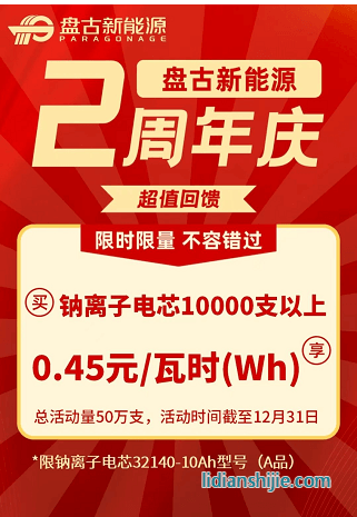 盘古新能源开启2周年大放送,采购钠离子电芯1万支以上可享优惠单价0.45元/Wh。