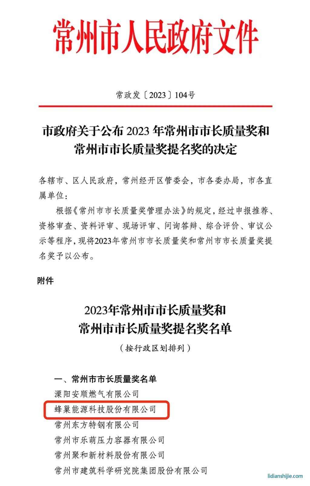 核心提示:顺应质量强国战略蜂巢能源荣获2023年常州市“市长质量奖”12月20日,常州市市政府公布了2023年常州市市长质量奖和常州市市长质量