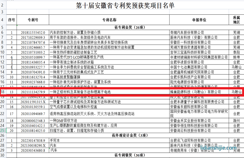 近日,安徽省市场监督管理局(知识产权局)官方网站发布了《第十届安徽省专利奖评选结果公示》。据公示内容,蜂巢能源科技(马鞍山)有限公司申报的 “一种正极材料及其制备方法和锂离子电池”发明专利获得“安徽省专利金奖”。