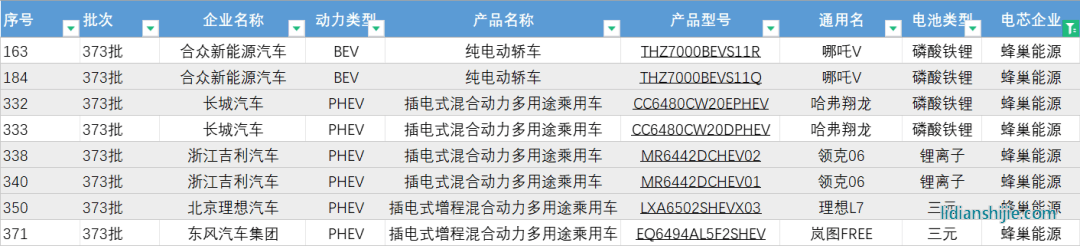 此外,在近日工信部发布的新能源车型公告中,蜂巢能源配套车型快速增加,PHEV车型表现更是突出。在第372批次公告中,蜂巢能源配套的新能源乘用车车型达到12家,其中PHEV车型8款。而在373批次公告中,蜂巢能源分别为长城、理想、吉利、岚图等多个车企的8款新能源乘用车车型提供电池配套,其中PHEV占到6款,充分显示出其在插混市场的受欢迎程度。