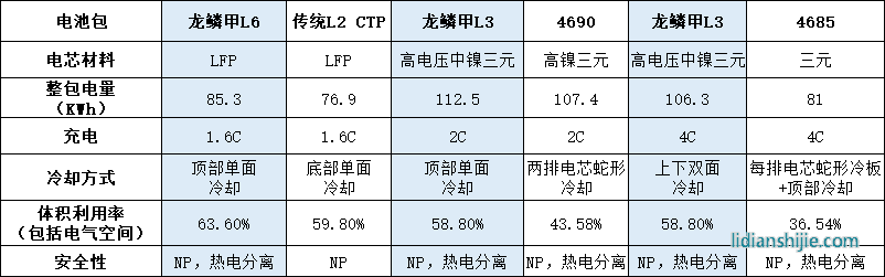 以龙鳞甲电池(铁锂L6叠片)为例,其与传统铁锂CTP(L2卷绕,CTP 2.0结构)相比,整包电量提升10.9%,热失控都可做到NP,但龙鳞甲电池热电分离,安全性更高。