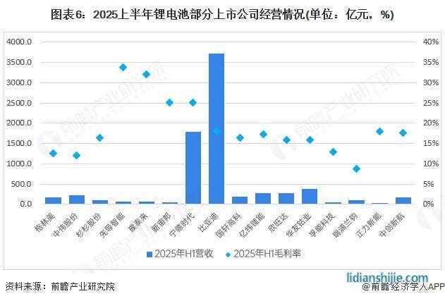 2025上半年锂电池代表性企业收入中,最高的是比亚迪,超过3500亿元,宁德时代为1788亿元,毛利率为25%,是所有企业中最高。亿纬锂能为281.7亿元,毛利率为17.3%,尽管和宁德时代差距较大,但是在上市公司中收入规模庞大。欣旺达收入为26.9亿元,毛利率为15.8%,国轩高科收入为19.39亿元,毛利率为16.4%。孚能科技收入较低,为43.5亿元,毛利率13%。