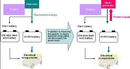 松下电器近期开发出一款镍氢能量回收系统,这款系统专为配备启停系统的汽车设计,其额定电压为12V。车辆在制动过程中,产生的热量将被转化储存在电池中,这些被储存的能量将来则为汽车电气系统提供电力,从而确保在发动机没有运行时,电气系统的正常供能。该系统同样可以用来给辅助马达提供电力驱动,以提高汽车燃油经济性。