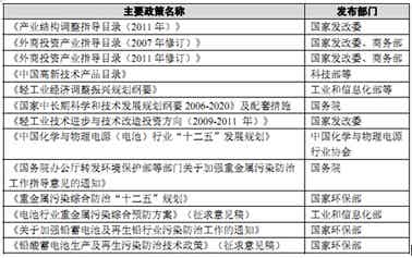 国家发改委在《轻工业技术进步与技术改造投资方向(2009-2011 年)》中将新型电池关键技术、材料与设备产业化列为重点行业技术创新与产业化,并明确指出其包括新型结构铅酸蓄电池、动力型锂离子电池和电极材料、隔膜、电解质等关键材料制备技术;另外在推进行业节能减排部分着重列示了电池产业,主要节能减排方向包括锂离子电池替代电动工具用镍镉电池以及废旧铅酸蓄电池规模化回收再利用。