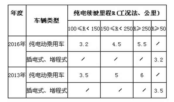 通过对比可以看到国家对电动乘用车技术要求提高了:最低续航里程提升至100公里以上的才可以享受补贴(2013—2015年从80公里起)。150≤R<250和R≥250两档的补贴额比2013年各少了5000元,而100≤R<150档的补贴额度少了3000元,可能是考虑最低续航里程提升至100公里,适当给车企一些心理安慰。