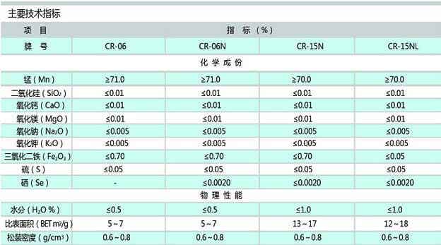 公司用于磁芯生产的四氧化三锰产品有CR-06、CR-06N、CR-15N和CR-15NL等多种牌号。其中高比表面积四氧化三锰CR-15N已获两项国家发明专利,现已开发出的高纯低铁四氧化三锰可应用于锂离子电池锰系正极材料。