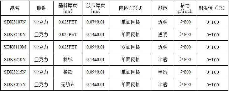 以棉纸/无纺布/聚酯膜为基材,双面涂以特定复配亚克力胶水;利用特殊贴附压纹离型材料组成的高性能双面胶。