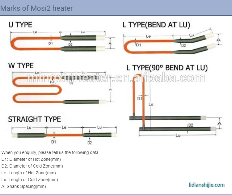 1800度硅钼棒用于超高温型试验炉子,炉内温度在1700-1800度左右,可选用热端直径6mm,冷端为12mm,当然有时候电炉很小的话可用直径3/6(主要取决于炉子的大小)的。选用合适规格的硅钼棒对电炉来说是非常关键的,第一看使用温度,第二看使用功率,第三是电压。一般情况下根据炉膛的长度,排布开来,基本上都U型硅钼棒。有的厂家想升温快,可以使硅钼棒的热端直径适当的增大减小一毫米,但是安装电炉硅钼棒数量就是要有功率以及电压的来决定,但是又怕电压达不到可以少几根也是可以的,排好距离就行,棒与棒之间的距离最好是同规格的中心距,合理的根据电炉所需的温度情况来决定硅钼棒的直径。注:使用电炉硅钼棒必须使用控电柜、一般厂家都会配备相配套的卡具。