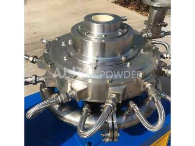 气流粉碎机与旋风分离器、除尘器、引风机组成一整套粉碎系统。压缩空气经过滤干燥后,通过多个拉瓦尔喷嘴高速喷射入粉碎腔,在多股高压气流的交汇点处物料被反复碰撞、磨擦、剪切而粉碎,粉碎后的物料通过高速旋转的分级轮,在离心力与向心力的作用下,使粗细物料分离,符合粒度要求的细颗粒通过分级区进入旋风分离器和除尘器收集,粗颗粒返回粉碎区继续粉碎。