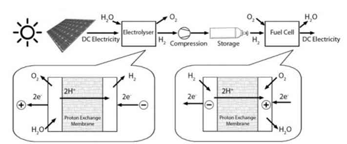传统系统需要电解水并分离出氢气和氧气,然后将之分别存储于燃料电池的两端。在需要产生电能的时候,氢气和氧气会被送到用于化学反应的电解槽。