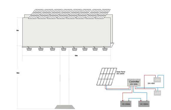 电池板采用高效的单晶组件,统一固定安装在两幅广告牌顶层,以倾斜15~30度角度朝向太阳,以达到阳光最佳照射角度,同时,可以利用自然风、雨水冲刷电池板表面,避免灰尘沉积而影响组件的发电效率。每面广告牌安装8盏LED投光灯,简距3米,灯臂伸展长度为2.5米,向上投射。