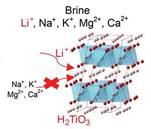 园田解释说,他们之所以决定研究钛氧化物是因为在锂的脱附过程中,钛氧化物比锰氧化物更稳定,因此钛氧化物可以多次重生,反复使用。只需用酸对Li2TiO3进行处理,就能将锂脱附下来,同时重生形成H2TiO3。受偏钛酸上离子交换位点的空间限制,这种材料对锂的选择性很高,而不会吸附卤水中的阳离子中,如钠、钾、锰以及钙。