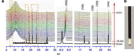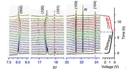 图7. 化学钠化过程中P2-Na0.66[Li0.22Ti0.78]O2材料的结构变化:同步辐射原位XRD图谱