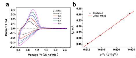 图8 Na+离子表观扩散系数测量:(a)不同扫描速度的CV曲线,(b)氧化峰电流与扫描速度(v1/2)的关系