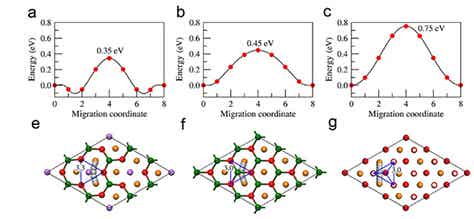 图2 Na+离子扩散活化能和扩散路径:(a, e) P2-Na[Li0.33Ti0.67]O2,(b, f) P2-NaTiO2,(c, g) O3-NaTiO2