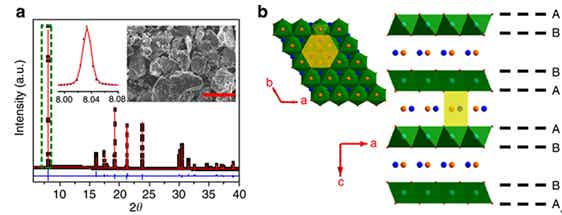 图3 P2-Na0.66[Li0.22Ti0.78]O2材料的形貌及结构图:(a) XRD图谱及形貌,(b)样品的结构图
