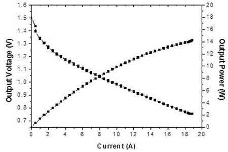 中国科学院宁波材料技术与工程研究所动力锂电池工程实验室在优化阴极空气扩散电极的结构与制备工艺,以及开发高性能的锰氧化物氧还原催化剂的基础上,成功研制出1000Wh镁空气电池样机,详见图1所示。该电池由5个单体电池串联而成,以AZ31镁合金为阳极,以10%的NaCl溶液为电解液,以上述空气扩散电极和锰氧化物催化剂为阴极。该镁空气电池的外观尺寸为200×150×150 mm3,重量为2.3 kg,能量密度可达430 Wh/kg,最大输出功率可达80W,其单体电池的I-V曲线如图2所示。上述镁空气电池具有较好的商业化前景,可应用为野外供电电源、移动电源、备用电源和应急电源等。