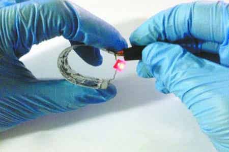 一个偌大的手机揣在兜里,鼓鼓的,在夏天总是感觉有些不方便,如果哪天手机可弯可卷,能像啪啪圈一样戴在手臂上应当是件很酷的事情吧。这样的手机需要什么样的电池呢?应该是可弯可卷的柔性全固态薄膜锂电池。现在实验室已经研制出了这样的锂电池。国外有报道称已经在80μm厚的柔性Al箔上沉积Al/Li8V2O5/LiPON/V2O5/Au,制备出了柔性薄膜锂电池,该电池在10μA/cm2电流密度下循环次数超过5800次,容量衰减小于7%。自2003年起,国内一些高校和科研院所陆续开展了柔性薄膜锂电池的研究,但这些研究主要集中在关键材料制备上,缺乏电池整体制备技术,仍处于基础研究的初级阶段,同时受资金和技术制约,柔性全固态薄膜锂电池至今没有产业化的报道。中航工业航材院也组建了相应的团队,现已在超薄聚酰亚胺(PI)上实现了以LiPON为电解质的单芯柔性薄膜锂电池和串并联电池模块也在金属箔基片上实现了更适用于商业化的薄膜锂电池,实验数据目前在持续测试中,图为中航工业航材院制备的柔性薄膜锂电池的原理型样件。