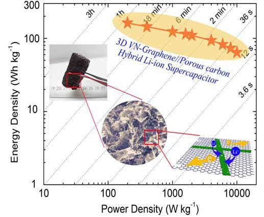 基于此,兰州化物所研究人员通过对各种锂电电极材料的本征结构和性能进行深入研究和分析,提出了有效解决正负电极材料动力学不匹配的新思路,即采用具有赝电容特性的氮化钒电极材料取代常用电池型的负极材料(如石墨、钛酸锂等)。研究人员通过进一步添加石墨烯,成功制备出了具有三维结构的氮化钒/石墨烯复合材料,从而极大提高了原有氮化钒电极材料的比容量、动力学性能和循环稳定性。在此基础上,将氮化钒/石墨烯复合材料作为负极,将前期自行研发的高比表面积多孔炭作为正极,组装出了兼具高能量密度和高功率密度的锂离子混合超级电容器。该器件工作电位窗口可达4 V,能量密度高达162 Wh/kg,且具有良好的循环稳定性,展示了良好的商业应用前景,为设计和研发高比能超级电容器提供了新的思路和方法。该研究工作近期在线发表在Advanced Functional Materials上。