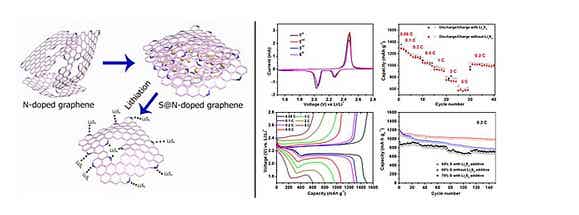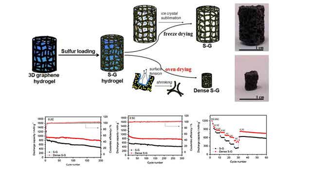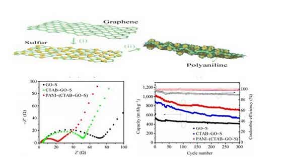 在国家自然科学基金委和中国科学院的大力支持下,中科院苏州纳米技术与纳米仿生研究所研究员张跃钢课题组,围绕纳米硫与石墨烯复合材料的合成及锂硫电池应用领域开展了广泛研究。研究人员利用聚苯胺改进氧化石墨烯纳米硫复合材料,有效减少电极材料的电荷传输电阻,抑制多硫化锂的溶解,提高了复合材料的放电比容量、库伦效率和循环稳定性(Nano Research,2014,7,1355-1363)。为进一步提高复合硫石墨烯纳米材料的导电性,抑制多硫化锂的穿梭效应,课题组成员进一步改进石墨烯氧化物,利用氨气对氧化石墨烯进行氮化,并将S纳米颗粒包裹于氮掺杂石墨烯片层中(S@NG)。以该复合材料组装的锂硫电池在不同倍率下均呈现出较高的比容量和稳定性,例如:0.2C时为1167 mA h g-1;0.5C时为1058 mA h g-1;1C时为971 mA h g-1;2C时为802 mA h g-1;5C时为606 mA h g-1。 该电池具有超长循环寿命,2000次充放电测试得到的每次循环平均容量衰减率仅为0.028%。该材料优异的性能归功于氮掺杂石墨烯片层中N功能基团对多硫化锂优异的吸附性,和氮参杂石墨烯优异的导电性,该研究结果也证实基于S@NG复合材料的锂硫电池在便携式电子、新型动力能源等储能领域具有巨大的应用前景(Nano Letters,2014, 14, 4821−4827)。此外,课题组成员运用低温反应,减缓化学反应速率,在3D还原氧化石墨烯上负载均匀的硫膜,并在空气中干燥使得3D还原氧化石墨烯孔洞收缩,得到致密的S-G复合材料,增强S与还原氧化石墨烯的粘附,固定纳米硫和抑制多硫化物的溶解损失,提高了S石墨烯复合材料的比容量和循环稳定性(Nano Energy,2015,12,468-475)。