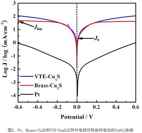 在QDSCs对电极的研究领域,引入了真空热蒸发镀膜(VTE)技术,在FTO(掺氟的氧化锡)导电玻璃基底上制备了CuxS(x=1-2)对电极,研究了VTE-CuxS对电极的催化活性、稳定性及电池的光伏性能。结果显示,VTE-CuxS对电极催化活性(图2)和稳定性(图3)均优于常用的黄铜片基底Cu2S对电极和Pt对电极。该研究工作实现了FTO玻璃基底上CuxS对电极的制备,解决了基底易被腐蚀的问题,并且VTE技术可实现对电极的大面积制备,可以满足未来QDSCs商业化生产的需要。研究论文发表在Electrochimica Acta (2015, 154, 47-53)上。