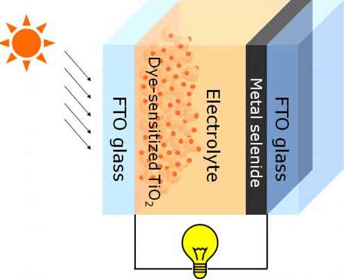主要由纳米多孔半导体薄膜、染料敏化剂、氧化还原电解质、对电极和导电基底等几部分组成。纳米多孔半导体薄膜通常为金属氧化物(TiO2、SnO2、ZnO等),聚集在有透明导电膜的玻璃板上作为DSC的负极。对电极作为还原催化剂,通常在带有透明导电膜的玻璃上镀上铂。敏化染料吸附在纳米多孔二氧化钛膜面上。正负极间填充的是含有氧化还原电对的电解质,最常用的是I3-/I-。