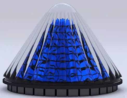 一个一米直径大的锥形支架上,装着几百个三角形的光伏电池,包裹在一个“密封外透镜聚光器”里面。光伏旋转的动力来自少量的太阳能电力和磁悬浮系统,减少了噪音,也几乎无需保养。