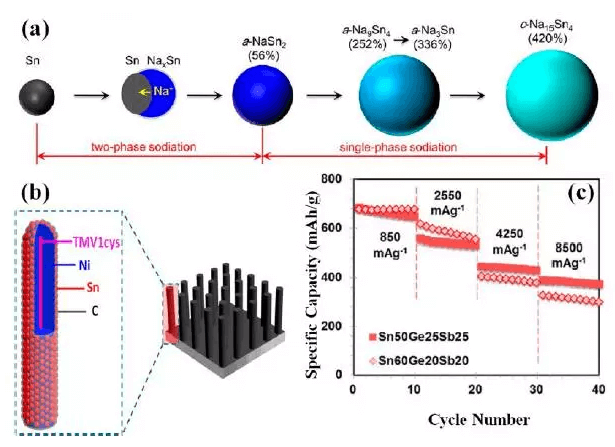 合金负极也是一种十分具有吸引力的负极材料,例如锡基和硅基材料,由于其较高的比容量,成功吸引了人们的注意。当然与锂离子电池一样,这些材料仍然存在膨胀过大的问题。锡基负极能与Na形成Na15Sn4合金,比容量可达847mAh/g,但是这也伴随着420%的体积膨胀,这极大的制约了锡基负极的应用。