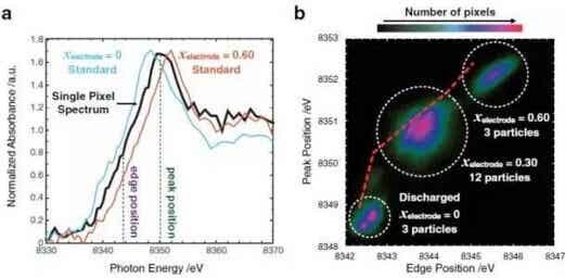 因此优化NCM材料二次颗粒的结构,有助于减少颗粒内部应力和Li分布不均匀性,从而提高材料的循环寿命。试验中William E. Gent等人采用了共沉淀法合成了NCM材料的前躯体,研究发现该材料的二次颗粒的直径在10-15μm,一次颗粒的直径在500nm左右。实验中采用了观察Ni K边际吸收光谱的方式表征了Li在材料二次颗粒中的分散状态。研究显示,在原始颗粒和完全放电的颗粒中Li的分布是十分均匀的,但是在SOC值为0.3和0.6的时候,即便是经过了10个小时的搁置,二次颗粒中的Li分布仍然十分不均匀。同时也发现,充电电流和静置时间对这种不均匀性并没太大的影响,充电电流从1.1C降低了C/110,Li分散的不均匀性并没有太大的改善,静置170h锂离子电池分散不均匀的现象并没有明显的改善。