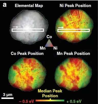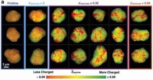 William E. Gent等人对此做出了假设,颗粒内部的应力和Li分布不均匀的产生,主要是由于二次颗粒的形貌造成,而和动力学特征无关,因此一些多孔结构和开放结构的材料展现出了更好的循环性能,这种结构能有效的吸收体积变化,降低充电过程中的应力和Li分布不均匀的现象。该研究给了我们很大的启示,一般我们期望通过限制截至电压来提高材料的循环寿命,但是通过研究发现,即使在较低的截至电压下,材料内部仍然会发生局部的过充现象,从而造成材料的失效加速。因此提高 NCM材料的寿命的方法更多的是依赖与NCM材料本身微观结构的改善,在降低局部的不均匀的同时,提高截至电压,从而达到在发挥材料较高的容量的基础上,改善材料的循环寿命。