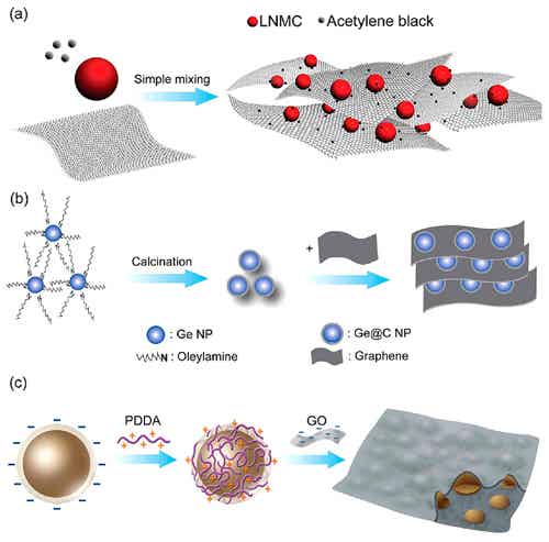 图2. 石墨烯三维导电网络结构复合电极材料: (a)简单共混法;(b) “双重保护”法;(c) 层-层组装法。