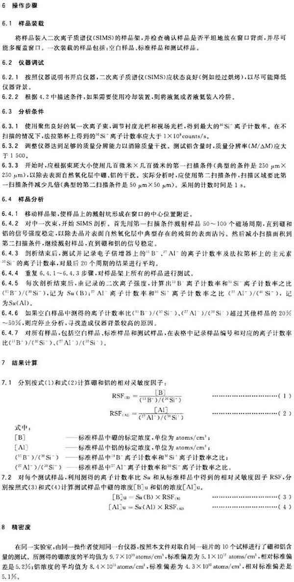 需要一个共掺杂或分别掺杂硼和铝的硅单晶标准样品,且硼和铝的体浓度经过各方都认同的其他测量方法测定,浓度在(1-10)×1015atoms/cm3范围内,分布均匀性在5%以内。标准样品的分析面应进行化学腐蚀抛光或者效果更好的化学机械抛光,使其平坦光滑。