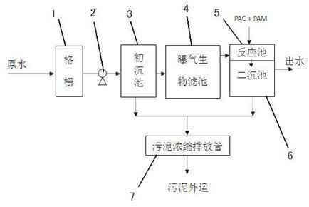 现结合图1介绍具体实施方式,图中标号为:格栅1;提升泵2;初沉池3;曝气生物滤池4;缺氧池41、43、45;好氧池42、44、46;反应池5;二沉池6;污泥浓缩排放管7。