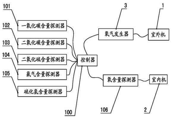 图1中的附图标号为:室外机1;室内机2;氧气发生器3;控制器100;一氧化碳含量探测器101;二氧化碳含量探测器102;二氧化硫含量探测器103;氯气含量探测器104;硫化氢含量探测器105;氧含量探测器106。