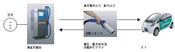 在充电连接线上附加电力供给线路,有多条EV与充电器连接的信号线。完全依据电动汽车协会议定书的EV与充电器的共用性,所以可适用于为各公司EV进行快速电。