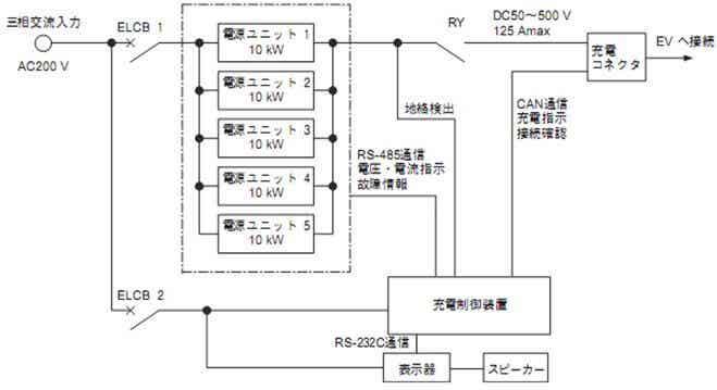 EVC-50KA的组成示于图2。快速充电器由电源装置、充电控制装置、显示器、充电用连接器及输入输出断电开关等构成,由最大输出功率50KW的快速充电器为EV用蓄电池充电15~30分钟可充电80%。另外,以从交流到直流的电力变换部分为10KW单位装置的结构,可适应于10~50kW的输出容量,在万一电源装置发生故障时,可随着其他完好的电源装置进行充电,方便替换故障装置,易于恢复原状,可实现可靠性能好,免维护的优异充电器。