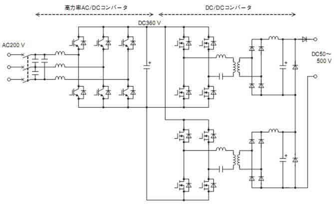 另外,输出电压达DC500 V与高电压后,降低了输出电变换部分的电压,为选定价格与流通性良好的通用部件,将2个DC/DC转换器串联。
