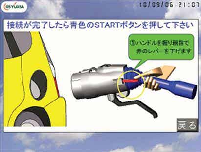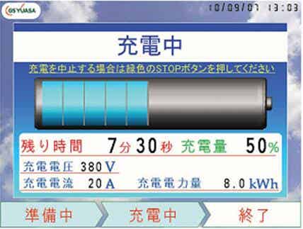 本次作为快速充电器的操作采用大画面(10.4型:211.2 ×158.4mm)的液晶彩色显示屏。显示器如图4所示,可一目了然确认充电时的蓄电池状态、充电电压、电流、电量等。另外,如图5所示,通过动画显示和声音输出可明确充电操作方法,对初始使用充电器的用户可容易而正确地进行充电操作。同时,显示器示出各种报警状况、计测值显示及维护情报等显示和设定操作。