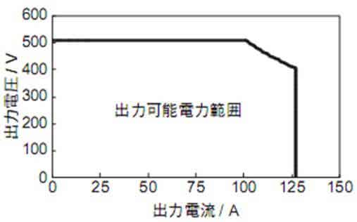 EVC-50KA的外观示于图6,快速充电器设置于各种场合,一般要侧重考虑用户的使用、充电器安装的环境及人性化地进行设计。以下将电气的规格列于表1。EVC-50KA的额定输出电量是50kW,最大输出电压500V,最大输出电流为125A,并具有图7所示的输出功率。另外,作为选项可以搭载在非触摸式IC读卡机上,也可以对应各种证明及核款系统。