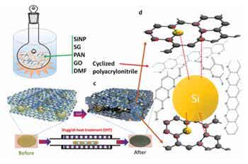 由硅纳米颗粒、硫掺杂的石墨烯以及聚丙烯腈混合材料涂覆后的负极极片经高温处理后,硅会与周围硫化石墨烯中的硫以共价键的相互作用被相对固定到一个位置,而聚丙烯腈将会进行环化反应形成一个含氮的稳定六圆环结构的石墨化碳。如此,通过热处理,一个稳定的原子尺度的结构构筑成型;其中,一方面,硅通过共价作用被以石墨烯纳米片层所组成的支架所保护,另一方面,石墨化的聚丙烯腈形成的网络结构,进一步加强了对硅稳定的防护。