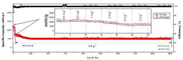 正是由于这种电极微观结构的构筑成型,使得电极在充放电过程中硅的体积膨胀能够被固定到一定的空间范围之内,电极结构不会被破坏,确保了电极能够到达2000次的循环寿命;另外,此结构体高的电子和锂离子传导性也保证了硅材料容量的正常发挥,即在0.1A g-1电流循环100次,整体电极的平均容量达到2750mAh/g-1;在更高倍率2 A g-1循环2275次,容量依然能够保持在1000mAh/g-1以上。